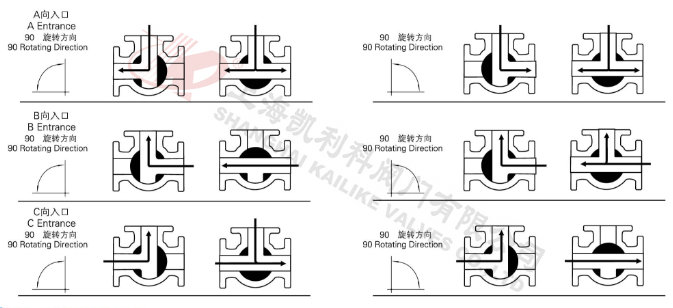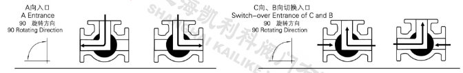電動(dòng)低溫三通球閥分L型和T型,介質(zhì)流通方向見(jiàn)下圖。L型電動(dòng)三通球閥適用于介質(zhì)流向的切換,能使相互垂直的兩個(gè)通道連通:T型電動(dòng)三通球閥適用于介質(zhì)的分流、合流或流向 切換,T型孔道可以使三個(gè)通道互相連通或使其中兩個(gè)通道連通,電動(dòng)三通球閥一般采用三個(gè)閥座結(jié)構(gòu),亦可根據(jù)用戶要求采用四閥座結(jié)構(gòu)。
