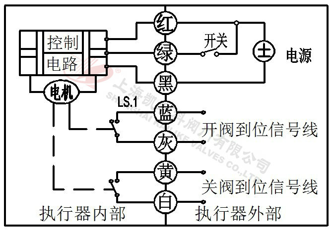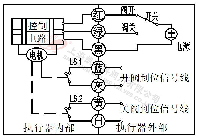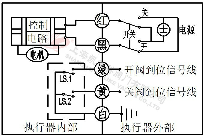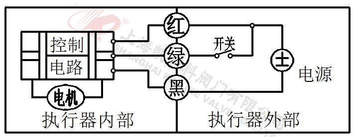 2、當綠線開關閉合,閥門關閉,到位后執(zhí)行器內(nèi)部自動斷電。