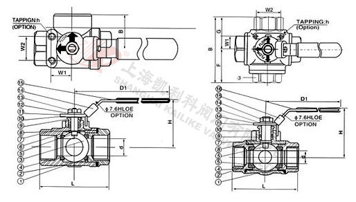 Q14F/Q15F三通內(nèi)螺紋球閥有T型和L型。T型能使三條正交的管道相互聯(lián)通和切斷第三條通道,起分流、合流作用。L型只能連接相互正交的兩條管道,不能同時保持第三條管道的相互連通,只起分配作用。