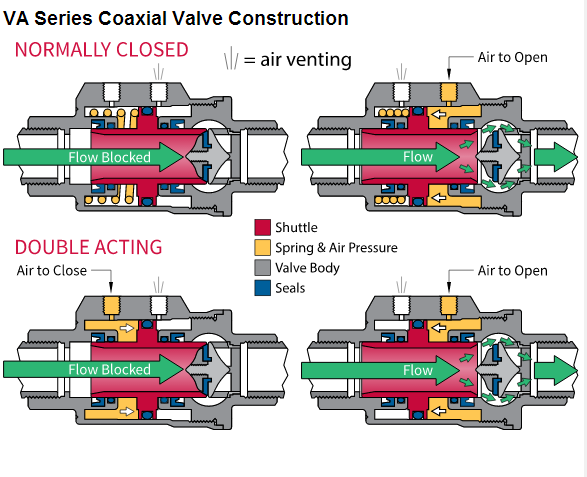閥2同軸的位置,閥可以是氣動或電動地驅(qū)動。電動版本使用電磁線圈和彈簧,類似于螺線管閥。該版本使用氣動空氣壓力和彈簧(彈簧復(fù)位),或空氣壓力在兩個方向(雙向)。使用同軸閥往復(fù)型障礙物,穿過介質(zhì)時打開。該傳送裝置移動到一個位置或另一個來執(zhí)行其功能,或者開/關(guān)或分流流量到適當?shù)某隹?。同軸閥(10)具有更大的流動通道的電磁閥相比,但仍然沒有完全的閥端口。那是真的,又有一個限制流量和壓力損失的增加。有風格多樣的同軸閥。兩個例子是VA系列氣動操作閥的開/關(guān)VAX系列電動或氣動同軸閥可在2-3開/關(guān)方式或雙向分流。對于許多應(yīng)用同軸ON/OFF閥使代替球形閥。同軸閥將提供較小的閥更快操作的球閥將典型地具有較高的流速與壓降較低。