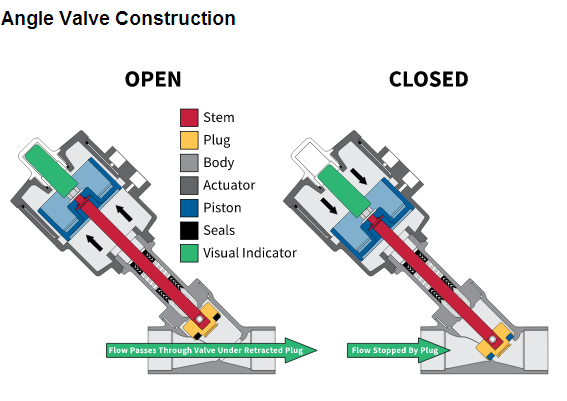 座椅角度的閥位置的閥2與內(nèi)置的氣動執(zhí)行器。所述致動器可以被返回彈簧作用或雙作用的。脫膜劑為插頭進入閥角度坐在傾斜座椅模制到所述閥的流動路徑。所述插頭被幾乎完全縮回時的流動路徑打開。這一因素使座椅角度閥門的最高流量快速作用閥具有最低的壓降。在許多應(yīng)用中打開/關(guān)閉,閥座的閥角度的完美替代品。他們采取快、成本更低并且持續(xù)時間更長。