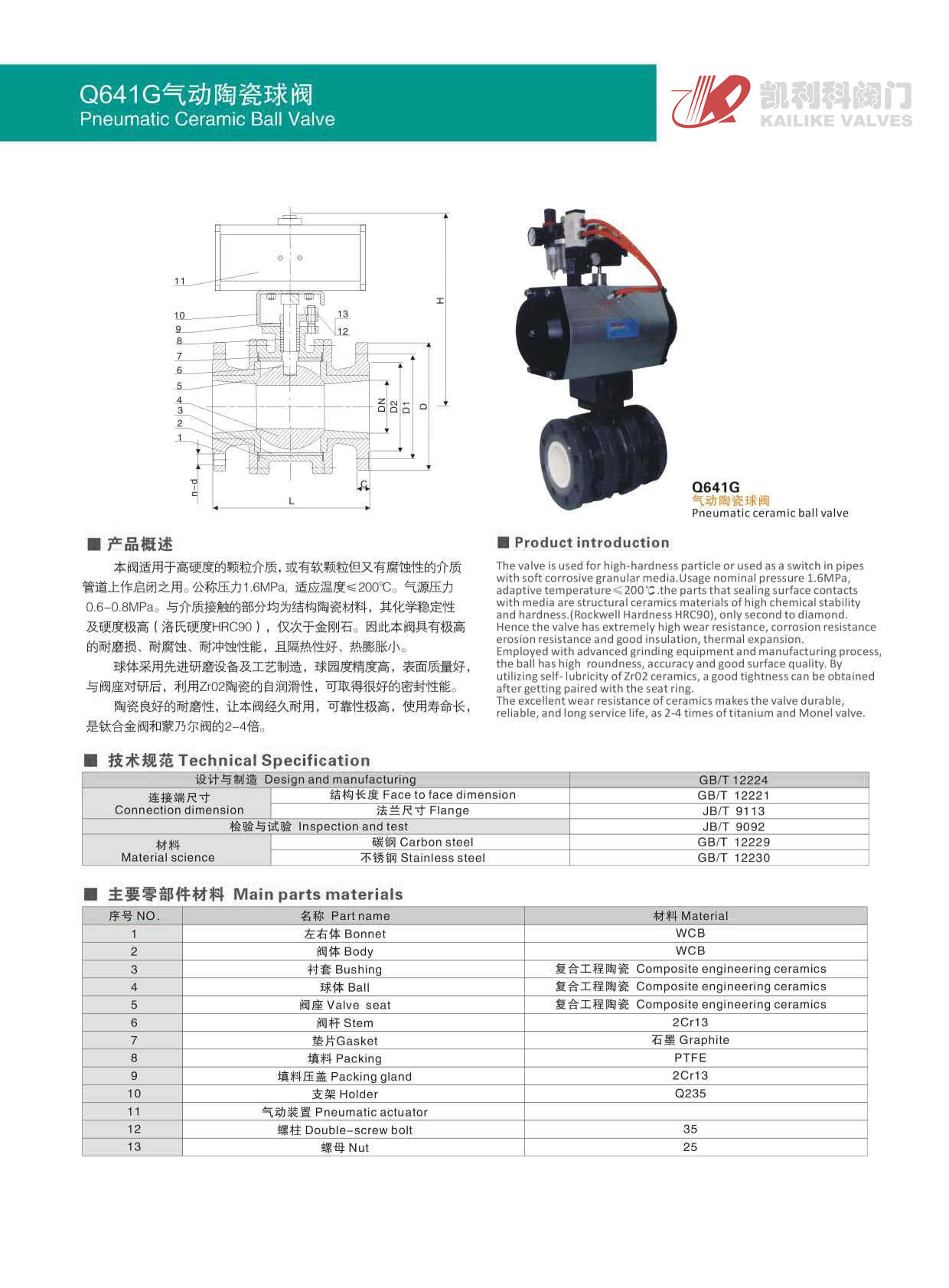 氣動(dòng)陶瓷球閥本閥適用于高硬度的顆粒介質(zhì),或有軟顆粒但又有腐蝕性的介質(zhì)管道上作啟閉之用。公稱壓力1.6MPa,適應(yīng)溫度≤200℃。氣源壓力0.6-0.8MPa。與介質(zhì)接觸的部分均為結(jié)構(gòu)陶瓷材料,其化學(xué)穩(wěn)定性及硬度極高(洛氏硬度HRC90),僅次于金剛石。因此本閥具有極高的耐磨損、耐腐蝕、耐沖蝕性能,且隔熱性好、熱膨脹小。